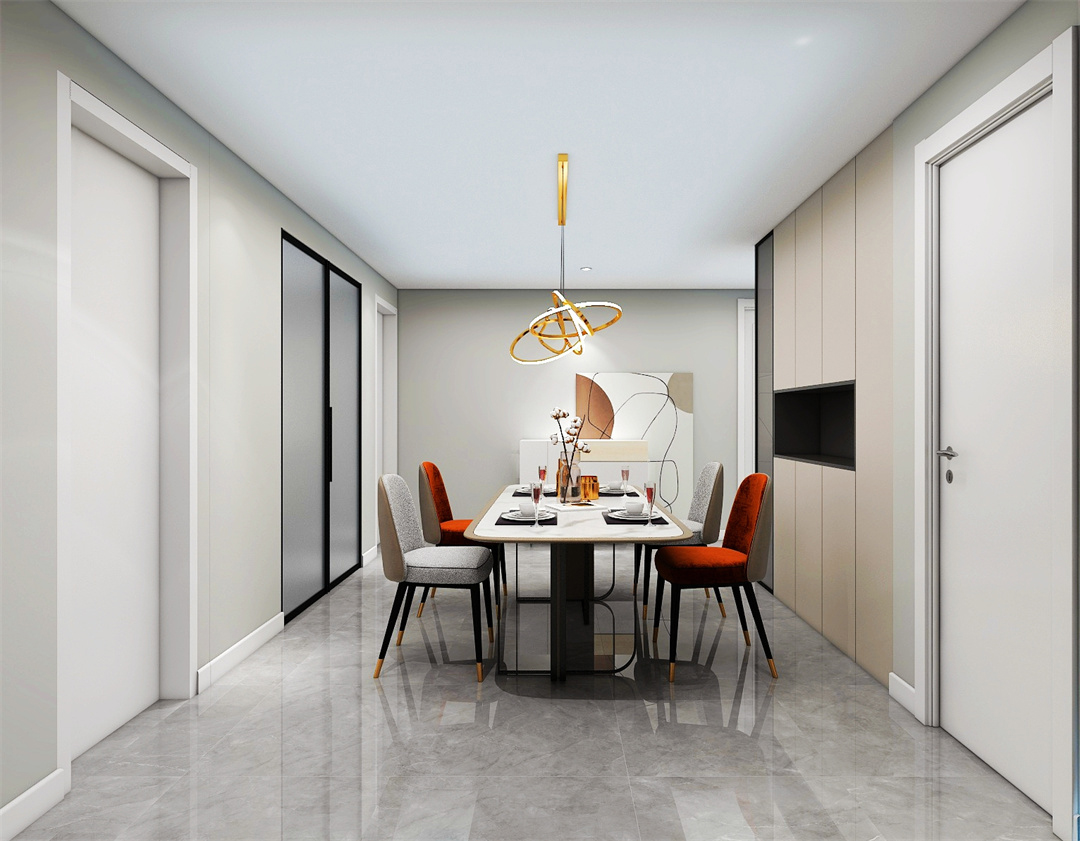 一張巖板餐桌搭配四張餐椅,簡約而不簡單,旁邊再放上裝飾畫,整個(gè)空間變得有滋有味。