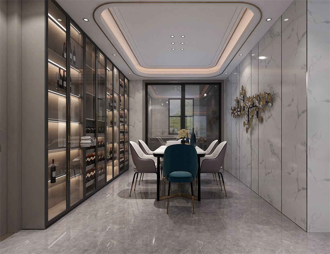 餐廳這里設(shè)計(jì)與客廳遙相呼應(yīng),設(shè)計(jì)感滿滿的酒柜,燈帶、藝術(shù)擺件等細(xì)節(jié)處理,描繪出時(shí)尚優(yōu)雅的生活。