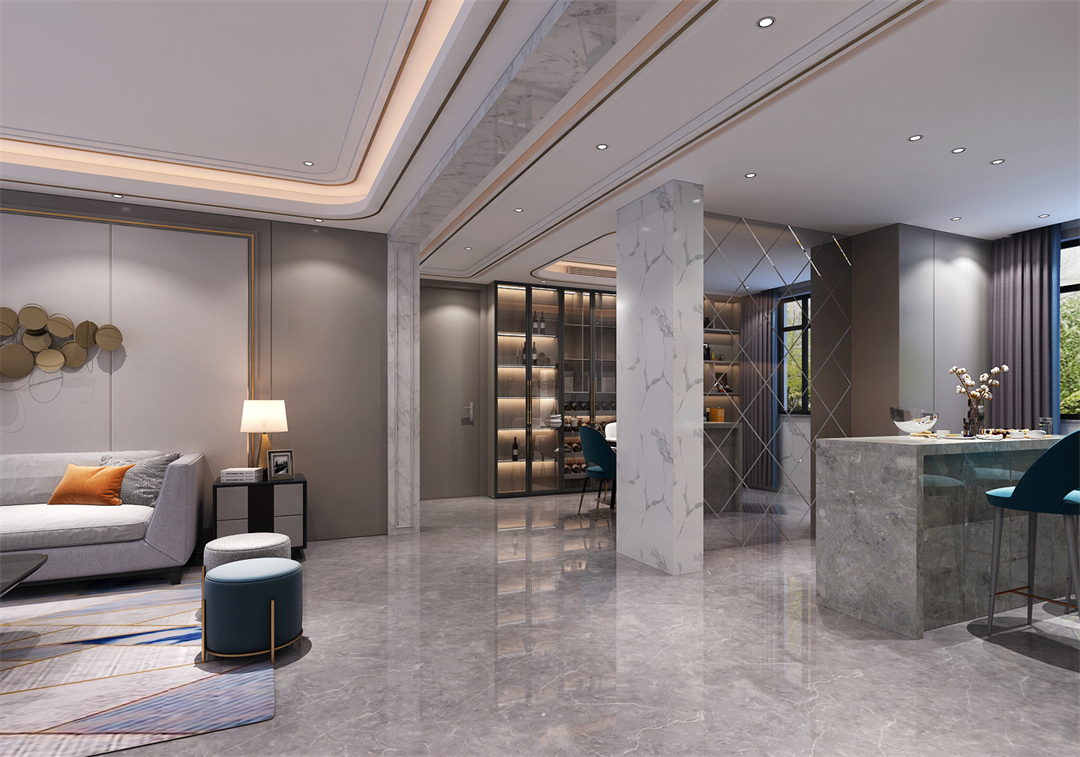 餐廳后邊是水吧臺(tái),鏡面背景墻的設(shè)計(jì)讓空間盡顯大氣。