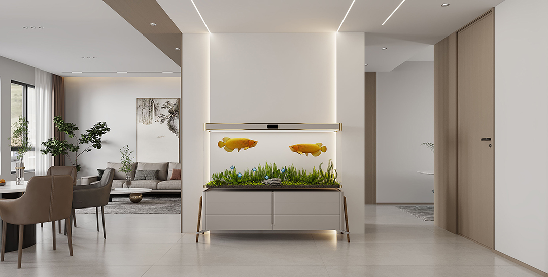 玄關(guān)設計簡潔大方,魚缸加上燈光,給人一種回家的溫馨感。