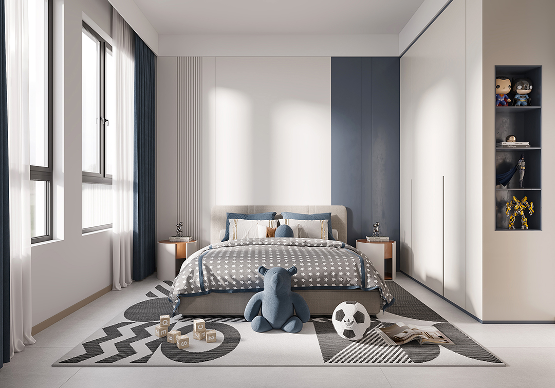 男孩房以白+藍護墻板作為床頭背景墻,配上同色系窗簾,優(yōu)雅靜謐,賦予空間自然舒適感。