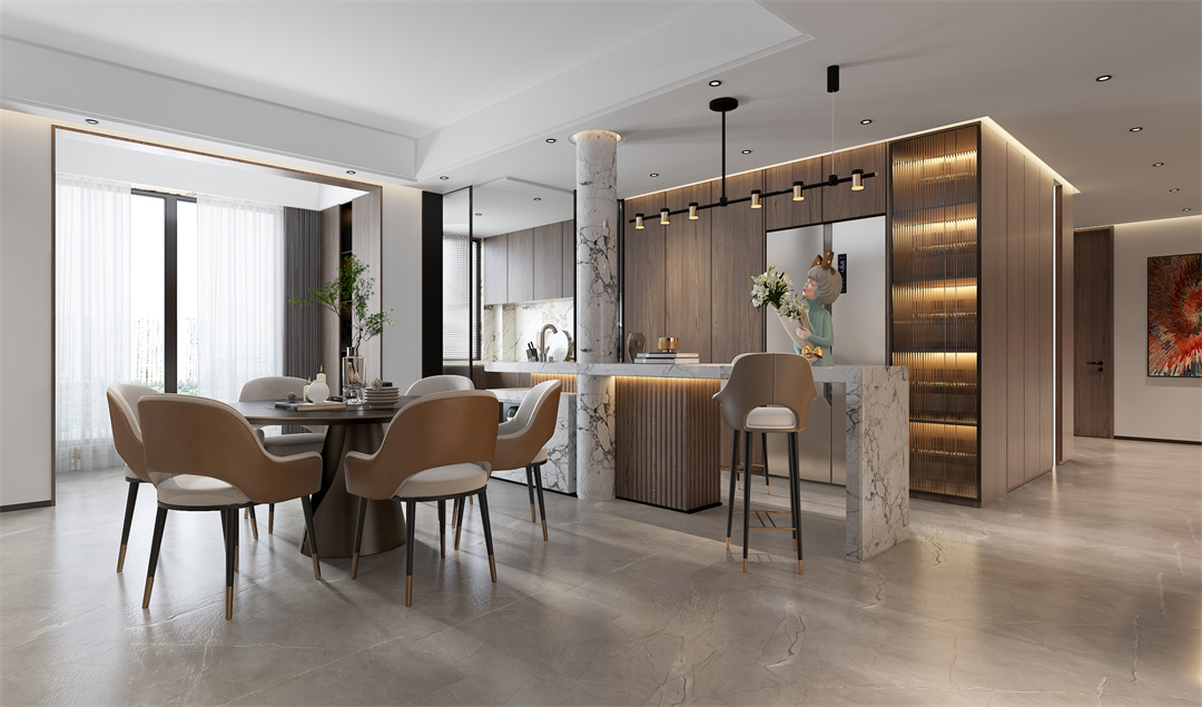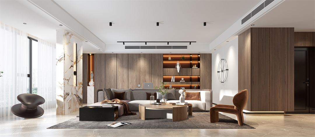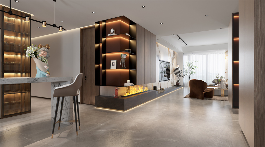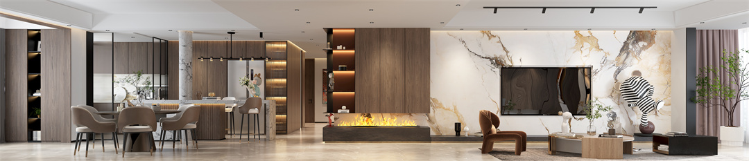 客廳影視墻采用巖板大理石瓷磚上墻,質(zhì)地比較現(xiàn)代且溫潤時(shí)尚,營造出大氣時(shí)尚的居室氛圍。