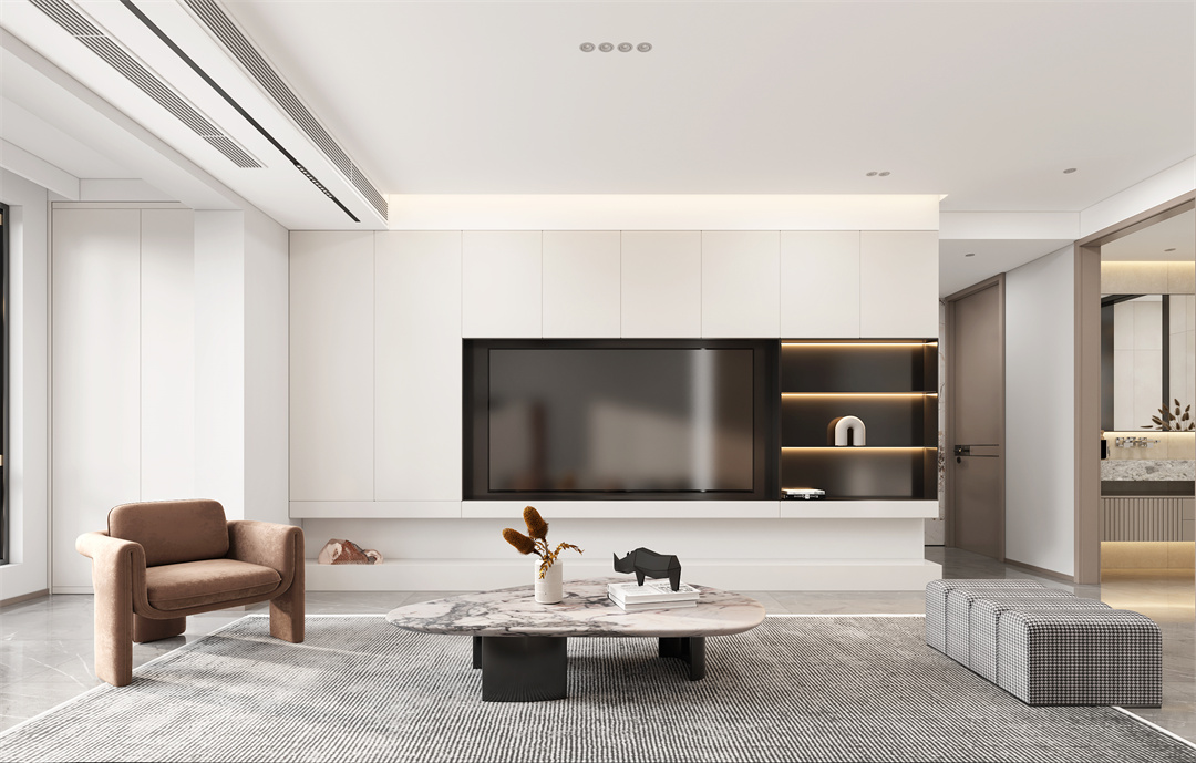 沙發(fā)墻以軟包工藝為基礎(chǔ),掛幅裝飾畫,布置奶白色布藝沙發(fā)與巖板茶幾組合,也讓空間顯得現(xiàn)代舒適而高級。