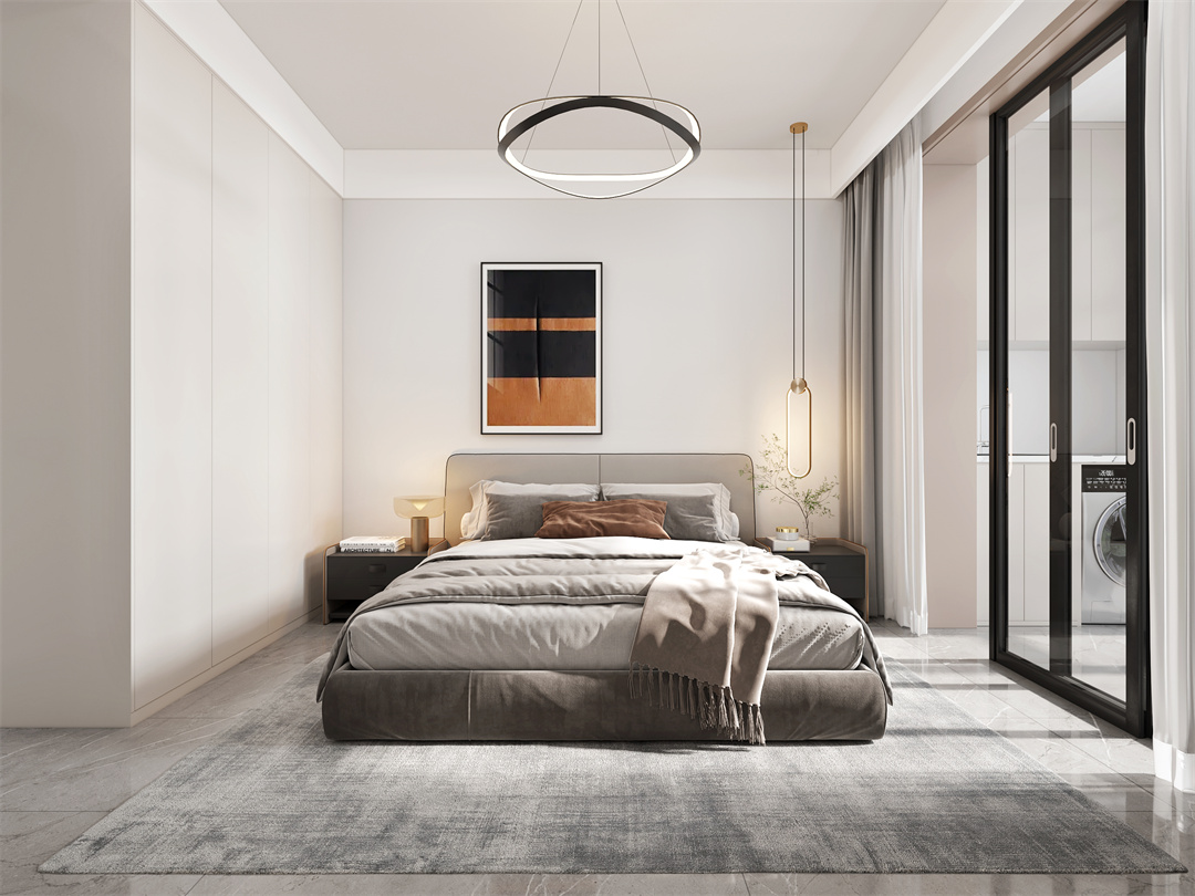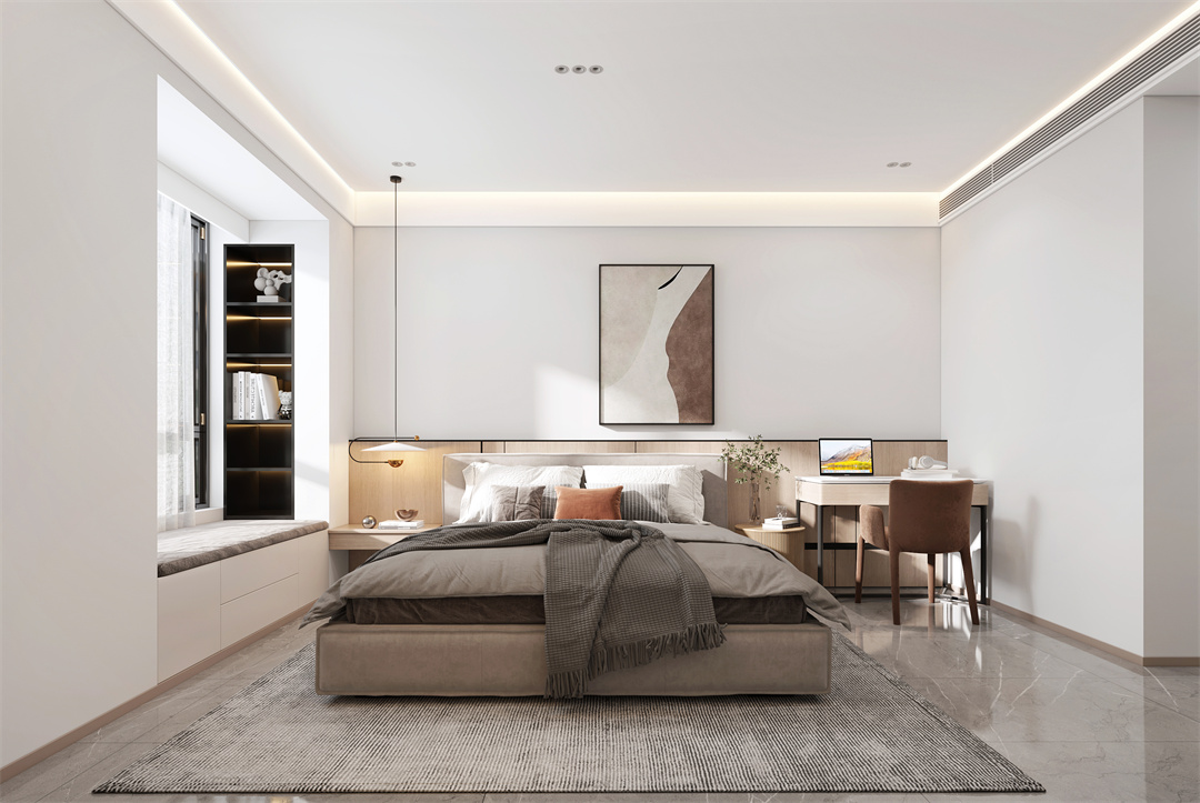 主臥整體硬裝與軟裝都以白色與木質(zhì)感的空間為主,加入灰色毯子與枕頭,也是點(diǎn)亮了空間的高級設(shè)計(jì)感。側(cè)邊的衣柜以白色為主,搭配在低調(diào)的高級灰空間里,效果也是更加和諧統(tǒng)一。