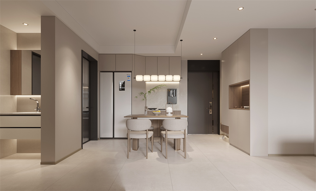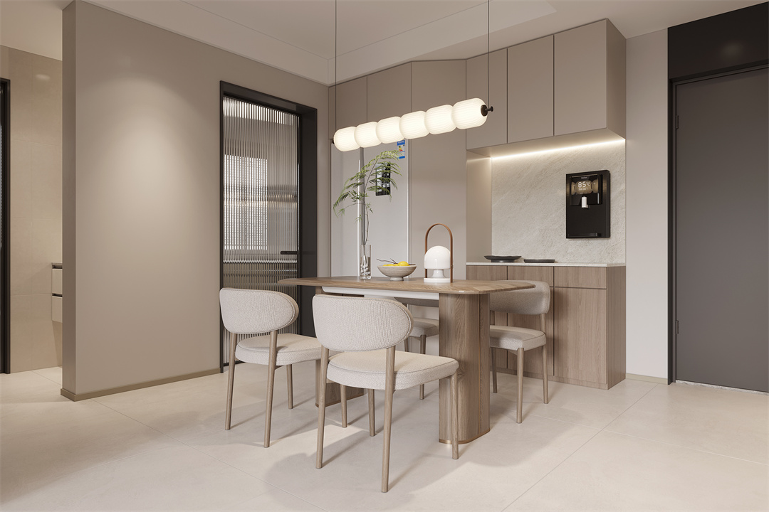 原木色餐臺(tái)搭配卡其色餐椅,一字極簡(jiǎn)吊燈營(yíng)造溫馨的就餐氛圍,提升空間質(zhì)感。