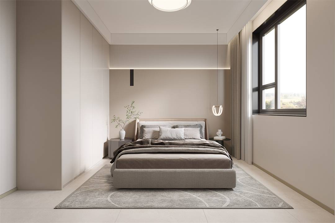 暖色系的地面瓷磚通鋪,加上的深色系地毯進(jìn)行打底,主燈通過(guò)點(diǎn)光源和隱形光源作照明,盡顯空間的簡(jiǎn)約大方。