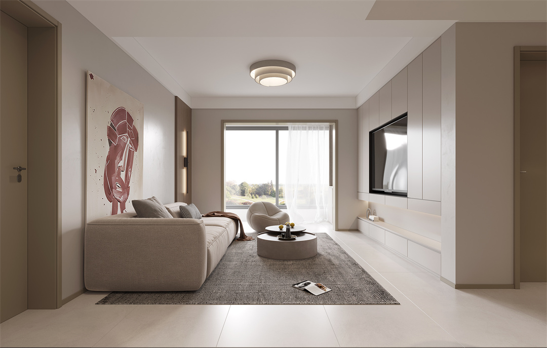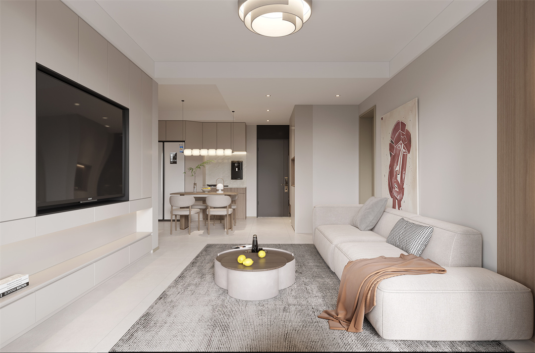 客廳的整體風(fēng)格簡(jiǎn)約大氣,陽(yáng)臺(tái)納入客廳的設(shè)計(jì)拓展了空間面積,同時(shí)提供室內(nèi)采光。電視背景墻采用留白設(shè)計(jì),搭配地臺(tái)提升溫潤(rùn)空間質(zhì)感。