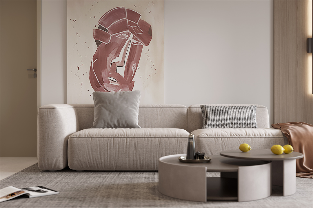 沙發(fā)背景藝術(shù)感十足,和電視背景風(fēng)格相呼應(yīng)。