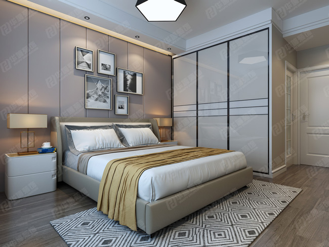 主臥,硬包床頭,稀疏的照片墻,初見(jiàn)便覺(jué)空間優(yōu)雅謙遜、低調(diào)內(nèi)斂。臥室在色彩的選擇上單純、飽滿(mǎn),再選用更為暖意的實(shí)木地板,使空間更加通透
