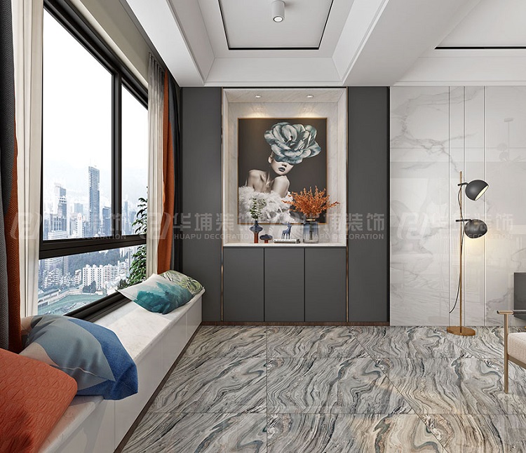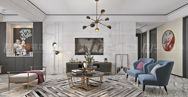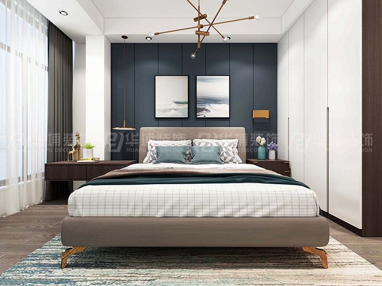 臥室部分一改大面積的灰色背景,用純凈白色做主打色,在加上些許的金屬色與咖啡色,床頭藍灰色硬包,剛柔并濟,表達出不一樣的輕奢氣質。