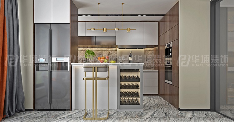 廚房采用開放式廚房加吧臺的組合形式,一方面增加了廚房的操作空間,另一方面吧臺可以提供一個簡單便捷的用餐區(qū)域,冰箱以及烤箱蒸箱做嵌入式,最大限度的利用了空間