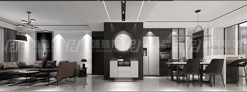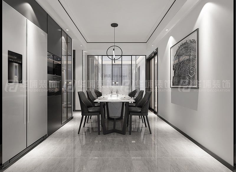 走過玄關(guān)就到了客餐廳空間,整個空間的地面鋪貼灰色地板磚,墻面選擇了留白的設(shè)計(jì),搭配黑色的餐桌椅和吊燈,顯得簡潔而又時尚。