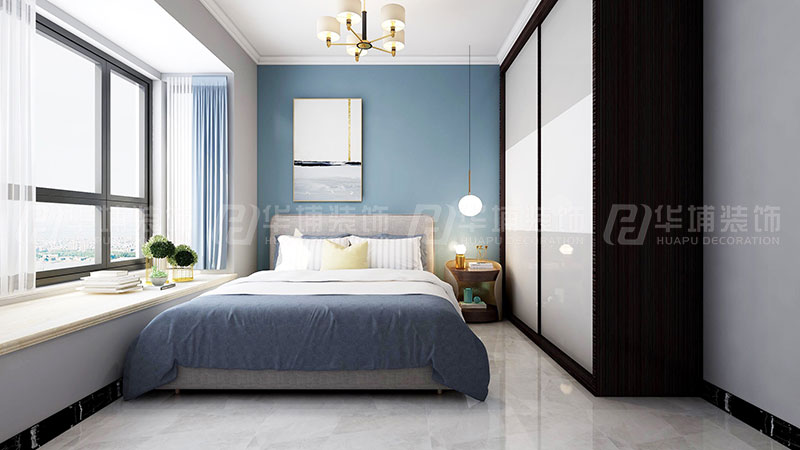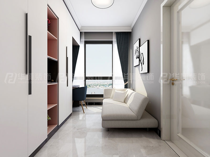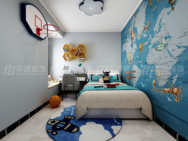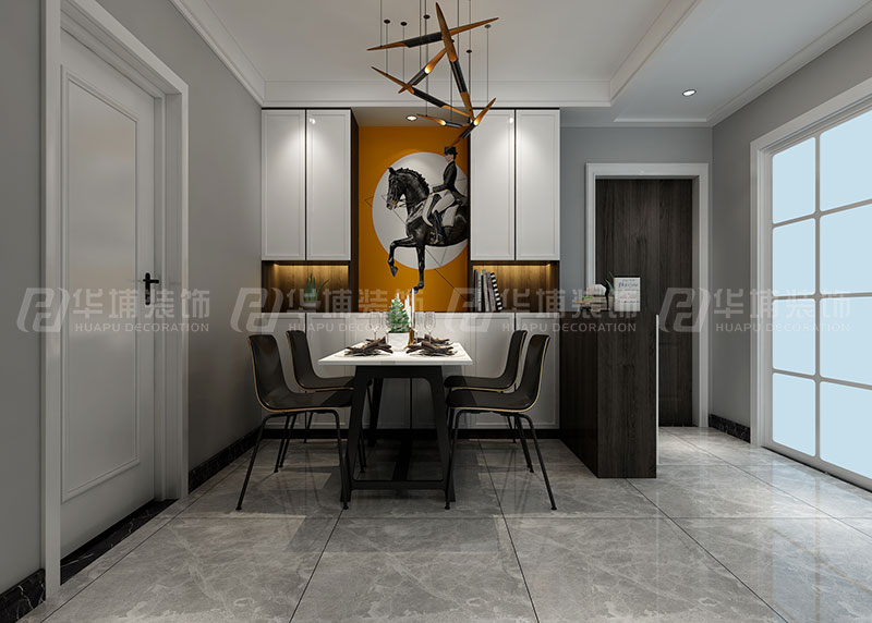 本案特點:室內(nèi)的頂、墻、地三個面,完全不用紋樣和圖案裝飾,只用線條、色塊來區(qū)分點綴