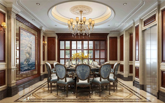 餐廳,典型的古典歐式風(fēng)格,以華麗的裝飾、濃烈的色彩、精美的造型達(dá)到雍容華貴的裝飾效果。墻面用高檔壁紙,或優(yōu)質(zhì)乳膠漆,以烘托豪華效果