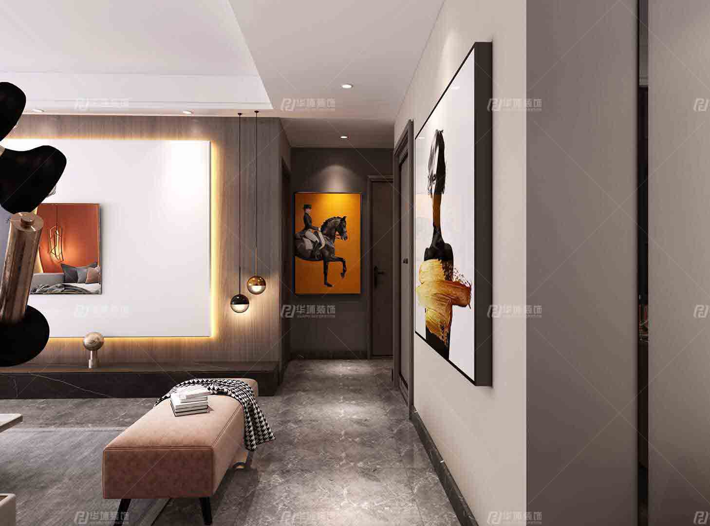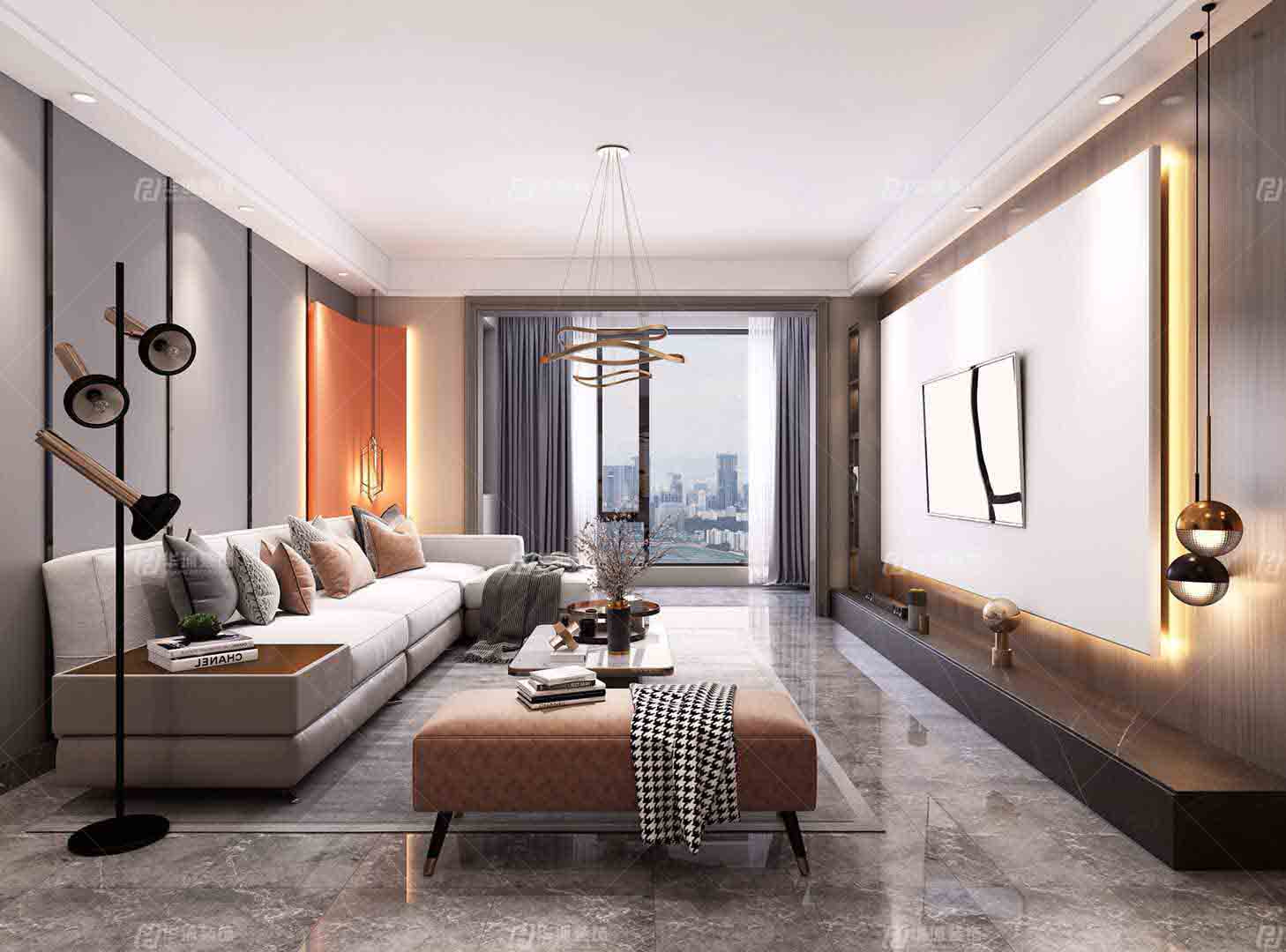 本案特點:本案主體以灰色為主,利用愛馬仕橙作為主色調(diào),增加空間的靈動性,使空間主體大氣而不失靈動。