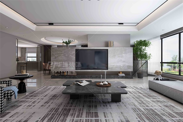 灰色的石材與整體呼應(yīng),而深色的茶幾家具使空間沉下來。