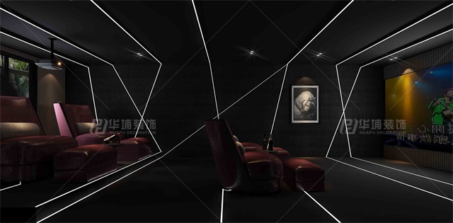 影音室頂、墻、地、連通交錯(cuò)的線條燈突出個(gè)性,昏暗的空間更具有家庭電影院的氛圍。