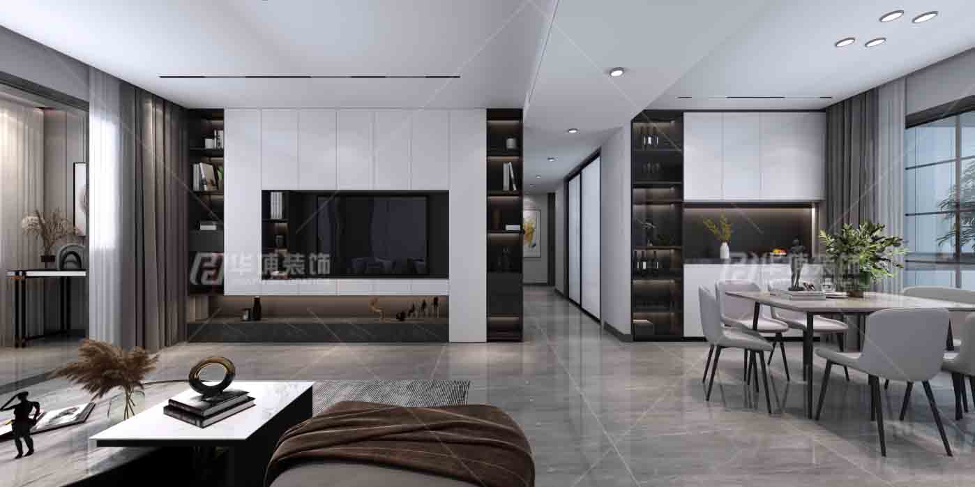 本案為現(xiàn)代簡約無主燈設計,整體吊頂采用平頂加錯層設計。