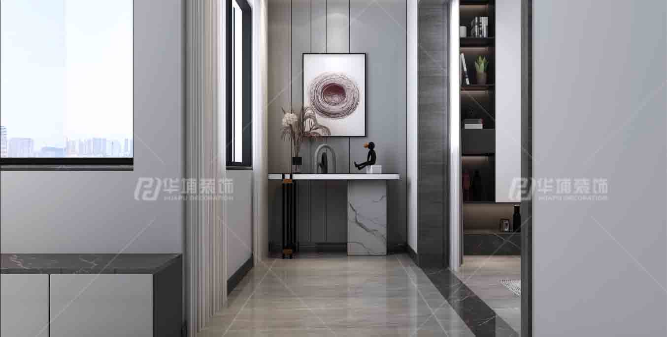 入戶玄關(guān)采用硬包設計。進入后眼前一亮,整體采光考慮射燈加磁吸燈設計。
