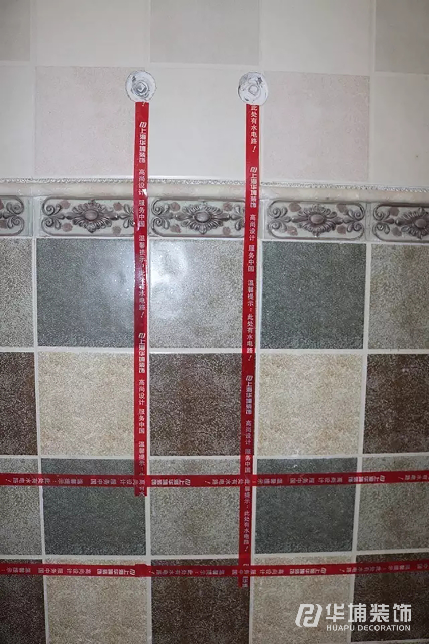 衛(wèi)生間墻磚的鋪設(shè),按標(biāo)準(zhǔn)張貼水電提示條。