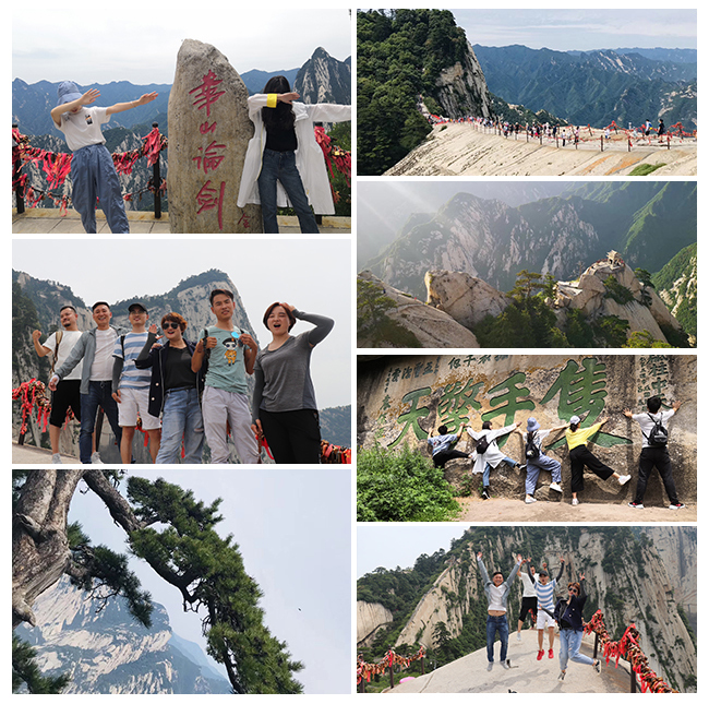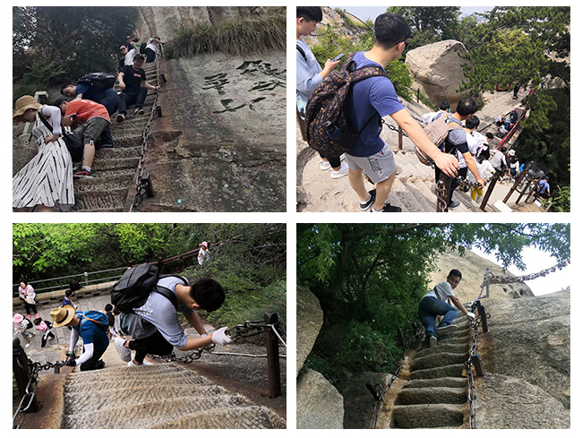華山的陡峭險峻,早已天下聞名。石梯盤旋于峭壁之上,需手握鐵索,手足并用攀登,確實驚心動魄。“幢去峽復來,天險不可瞬。雖云百尺峽,一尺一千仞?!?登峰論劍之路可謂險象環(huán)生,但這也恰恰點燃了華埔裝飾集團新生一代的熱血,不畏艱險,勇攀高峰,果敢前行!