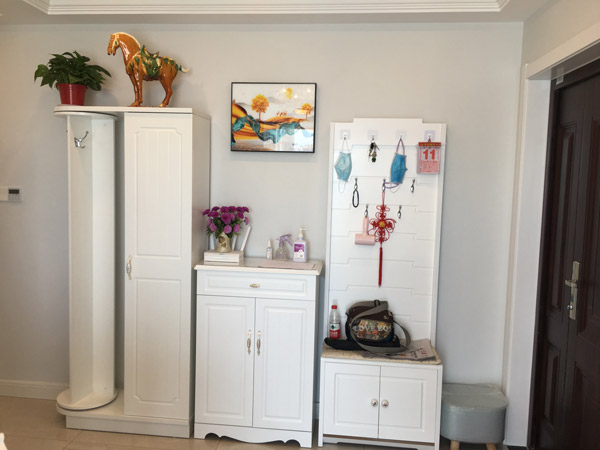入戶正對走廊,設(shè)計師用近乎單一的線條去排列,高低柜的組合,不濃烈不冷清,既起到隔斷空間的效果,同時也是歸納整理的“武器”,鞋子、包包、衣物等,都可以在這里找到容身之處。