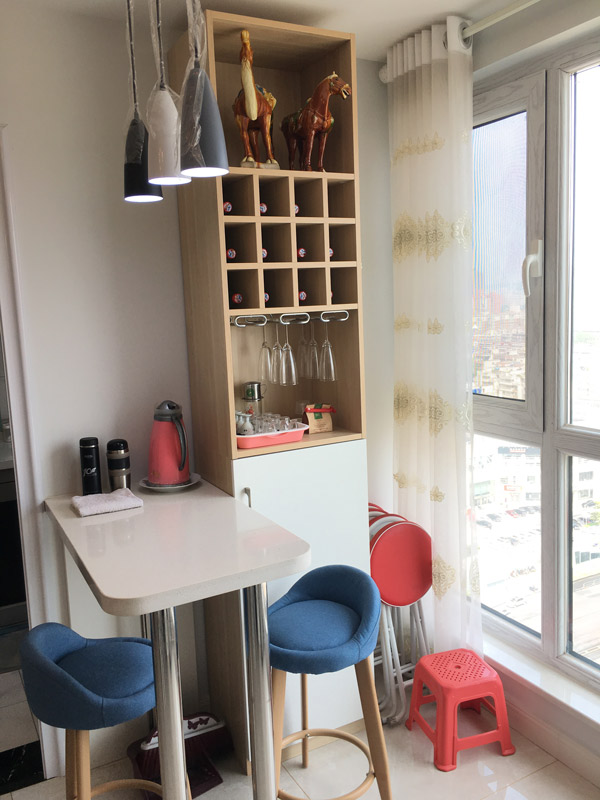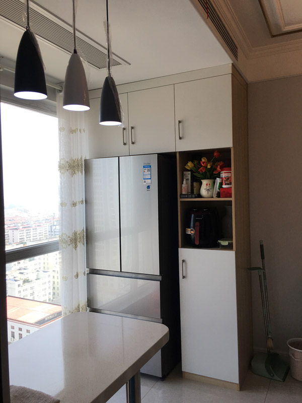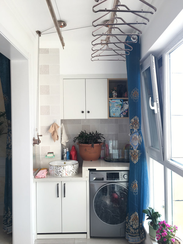 由于餐廳陽臺做了吧臺區(qū)域,設(shè)計師就把生活區(qū)放在客廳陽臺。一側(cè)做通頂?shù)墓褡邮占{雜物,一側(cè)做洗衣區(qū)。