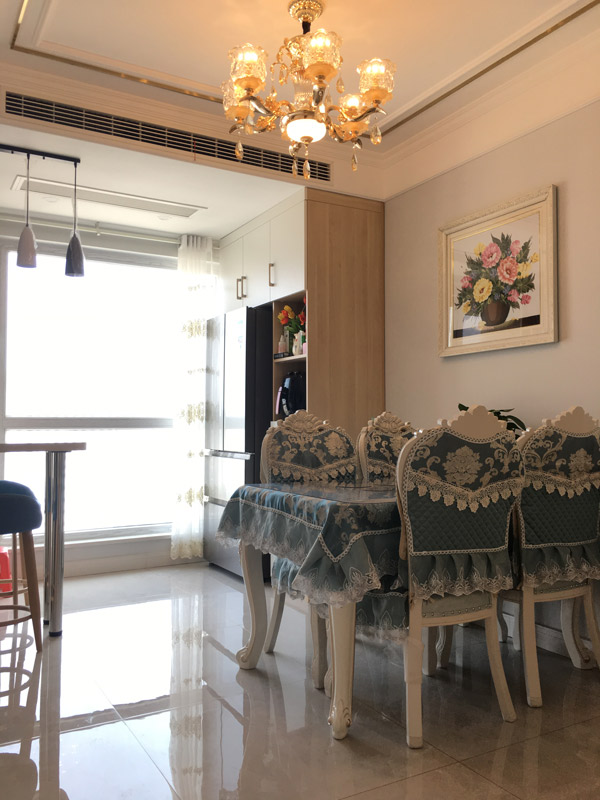 入戶左手邊是餐廚區(qū),餐廳以花草植物作為主題,純色的墻面背景裝飾手工裱畫,法式浪漫的藍色碎花餐桌布,當(dāng)一道道美食擺上餐桌,水晶燈柔和的光源映在食材上,仿佛置身“唐頓莊園”,且待須與時,總能給人大快朵頤的樂趣。設(shè)計師還利用陽臺空間做了吧臺和酒柜、餐邊柜,讓業(yè)主在喧囂過后,能夠靜享生活。