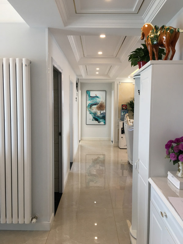 入戶走廊,為了弱化原有的橫梁,利用石膏線條+鍍鈦拉絲的不銹鋼線條做了一個三分區(qū)的造型頂。走廊盡頭以晶瓷的玄關(guān)畫點睛,輕紗曼舞,水晶鑲鉆,非常唯美 。