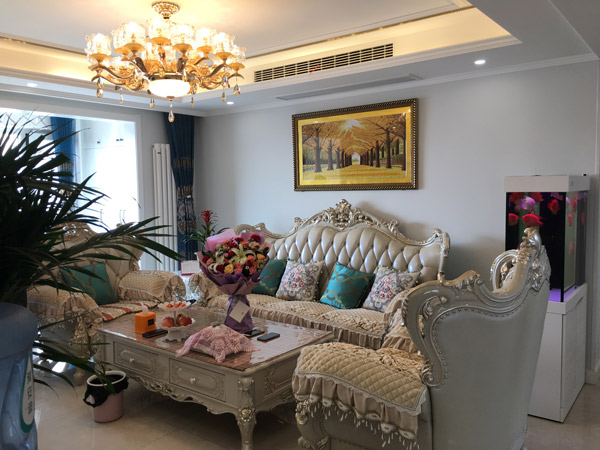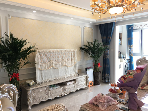 客廳整體的配色比較溫馨,淺灰色墻面,媽媽手工《黃金滿地》掛畫,再搭配上水晶主燈,3+1+1式歐風(fēng)沙發(fā),低奢大氣。電視墻為了節(jié)約預(yù)算,壁布+石膏線收邊,效果也是很漂亮。由于客廳做了中央空調(diào),所以利用燈槽吊頂營造氛圍光。吊頂中間走了一圈鍍鈦拉絲玫瑰金不銹鋼線條,再以太陽線修飾,層次感非常強。