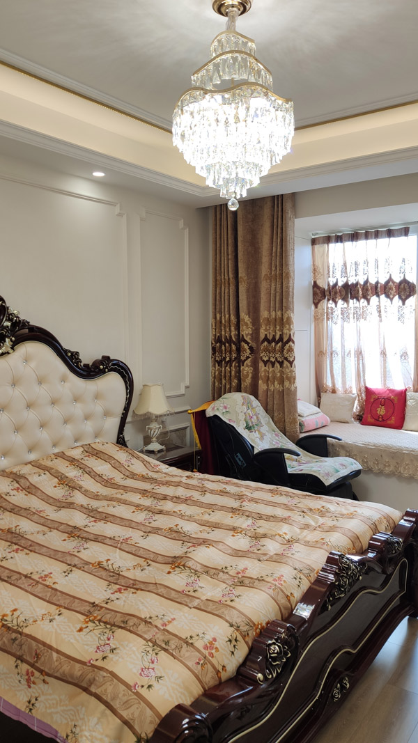 主臥是夫妻二人住的,所以在整體色彩包括軟裝的搭配上,都偏向沉穩(wěn)。天花板依然是水晶主燈,純白的乳膠漆床頭背景,厚重的窗簾,將歲月的痕跡流露。值得推敲的是主臥衣柜,新建了一堵60公分寬的輕鋼龍骨隔斷墻將它嵌進去,來解決墻體陽角收口的問題。
