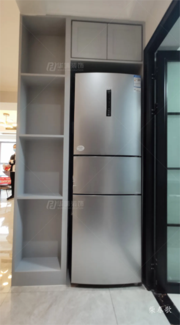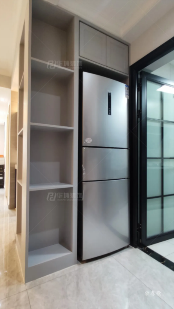 由于廚房沒(méi)有冰箱的位置,設(shè)計(jì)師利用入戶區(qū)域做了一堵墻,將冰箱內(nèi)嵌,同時(shí)做了很多開(kāi)放的展示區(qū)域,用作空間的修飾點(diǎn)綴。