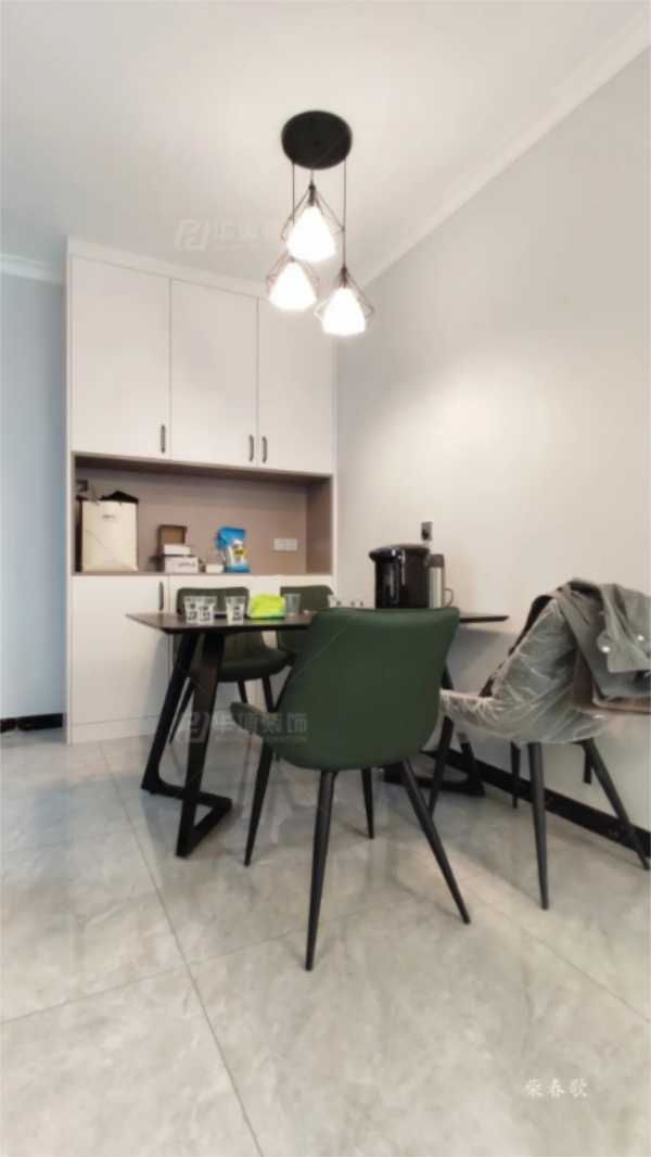 入戶左手邊是餐廳, 廚房門(mén)口新建的柜子剛好起到了隔斷空間的效果,完美遮擋隱私。餐廳整體的陳設(shè)很簡(jiǎn)單,四人位的餐椅,墨綠色靠背,深黑色磨砂材質(zhì)桌面,白色的中空餐邊柜,色彩的深淺搭配將層次感凸顯。