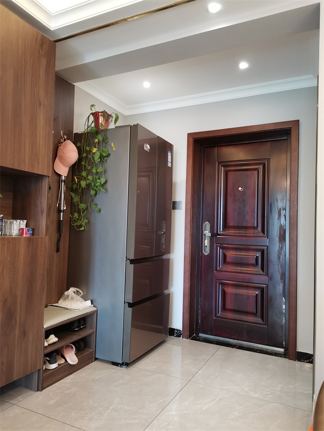 推開門,第一眼看到的就是冰箱。由于廚房空間不足,設(shè)計(jì)師特意將冰箱嵌入在玄關(guān)區(qū),拿取菜品比較方便。冰箱和玄關(guān)柜以頂面和帶換鞋凳的鞋柜功能分區(qū),完美利用了頂部橫梁,不顯突兀。