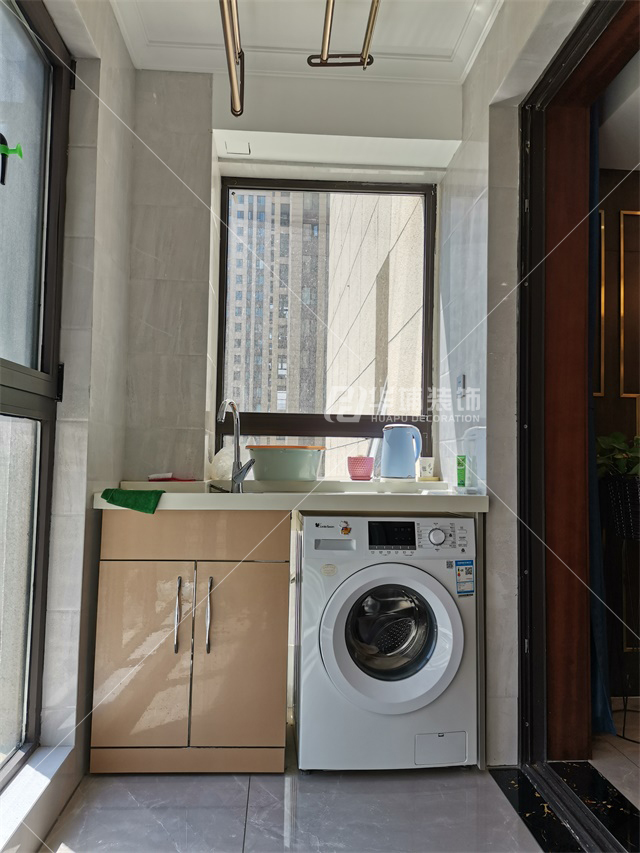 陽臺(tái)和客廳以玻璃推拉門隔斷,阻隔空間,但不影響光線的攝入。陽臺(tái)主要用作生活區(qū),洗衣機(jī)+地柜+洗手臺(tái)的設(shè)計(jì),承載生活的小幸福。