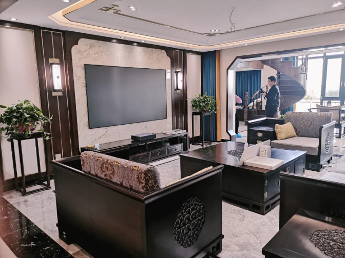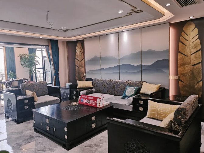 電視墻是石材+護墻板+不銹鋼金屬條做的凹凸造型,美中不足的是,受疫情影響,雕花隔斷一直沒有到位。沙發(fā)墻是兩側(cè)采用壁畫弧形凸出,嵌入燈帶燈槽,中間是山水水墨畫,用柔美來弱化線條的剛直。