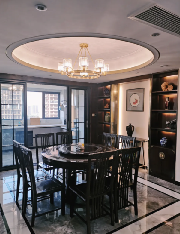 回字形地面,還做了窄邊灰和方拼,中式元素在這里得到了淋漓盡致的發(fā)揮。再轉(zhuǎn)身看餐廳背景,嵌入式酒柜,以不銹鋼弧形內(nèi)嵌燈帶做端景對稱,裝飾與照明效果極佳。