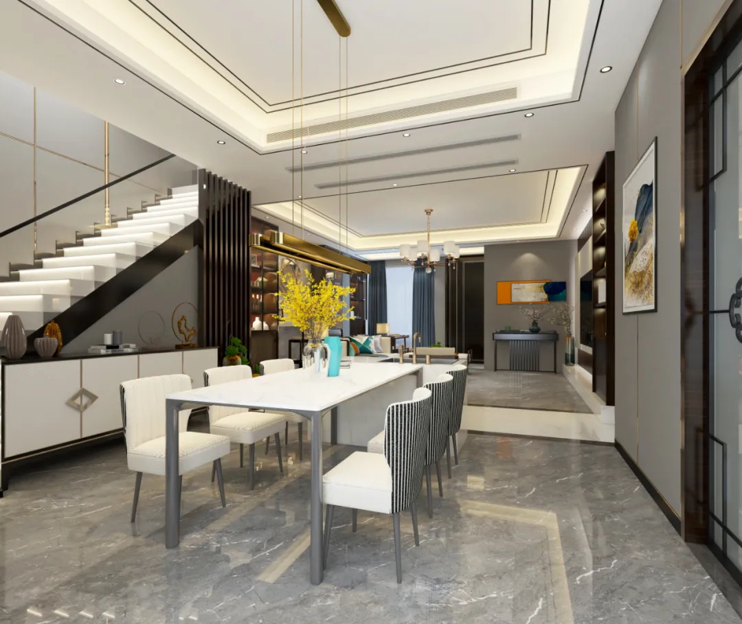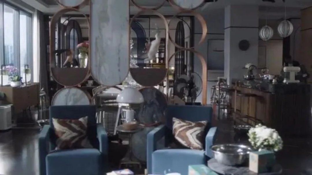 島臺(tái)另一側(cè)就是餐廳,擺放了一張大的夸張的餐桌,一半用餐,一半做下沉的淺水槽擺放水花狀的風(fēng)水局。因?yàn)轭櫦咽亲鰺熁ㄉ獾?,喬遷不能跨火盆,擺個(gè)風(fēng)水局寓意風(fēng)生水起、細(xì)水長(zhǎng)流。餐廳的天花上掛了一個(gè)投影儀,為了方便許幻山看設(shè)計(jì)圖用。