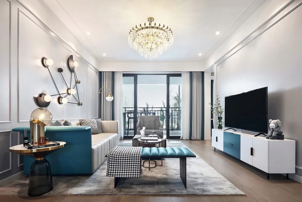 客餐廳以鏤空的金屬隔斷做功能分割,全開(kāi)放設(shè)計(jì),多處落地窗,組合沙發(fā),保持了整個(gè)空間的通透性??蛷d以莫蘭迪藍(lán)+金屬線條裝飾,低調(diào)的精致。