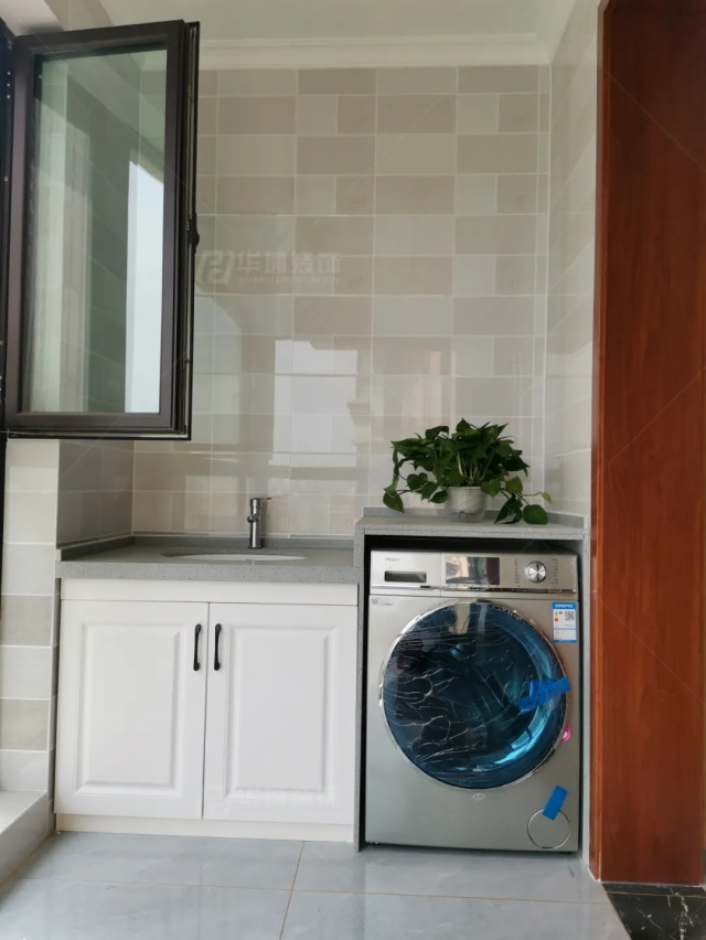 陽臺是生活區(qū),洗手臺+洗衣機(jī)+地柜,常規(guī)又實用的設(shè)計。