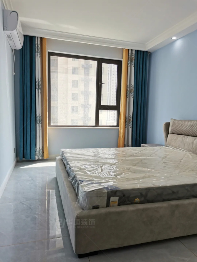 主臥以藍(lán)色調(diào)為主,不管是淡藍(lán)色的墻面背景,還是墨藍(lán)色的布藝窗簾,都將空間淡雅脫俗的氛圍感凸顯,尤其是到夏天,很清涼。