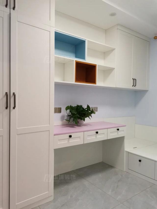 因為女孩還比較小,所以在色彩的運(yùn)用上選擇了比較甜美的粉色系,再通過白色、藍(lán)色的搭配點綴,將清爽、溫馨的氛圍營造。