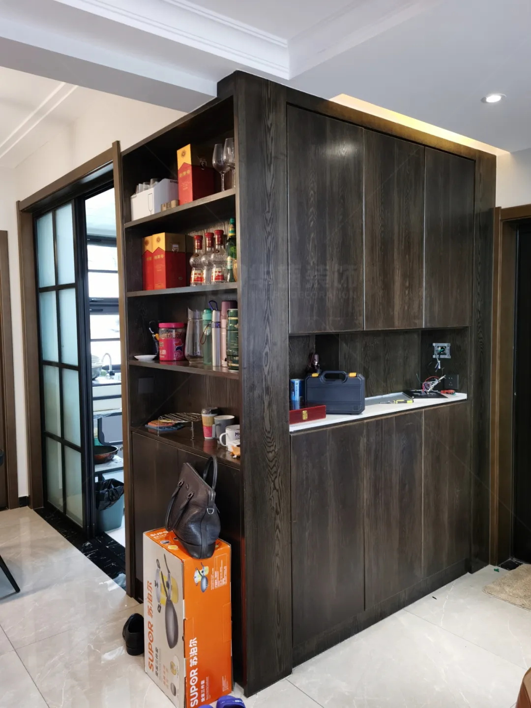 入戶是一個(gè)常規(guī)換鞋的區(qū)域,但本案是一個(gè)開門見廚房的戶型,沒有預(yù)留鞋柜,廚房?jī)?nèi)部也是沒有儲(chǔ)物和冰箱的位置。改造方案:設(shè)計(jì)師將原戶型中入戶廚房門那整面墻體砸掉,改成玄關(guān)鞋柜,做了上下分體,來滿足一家人鞋子的收納。