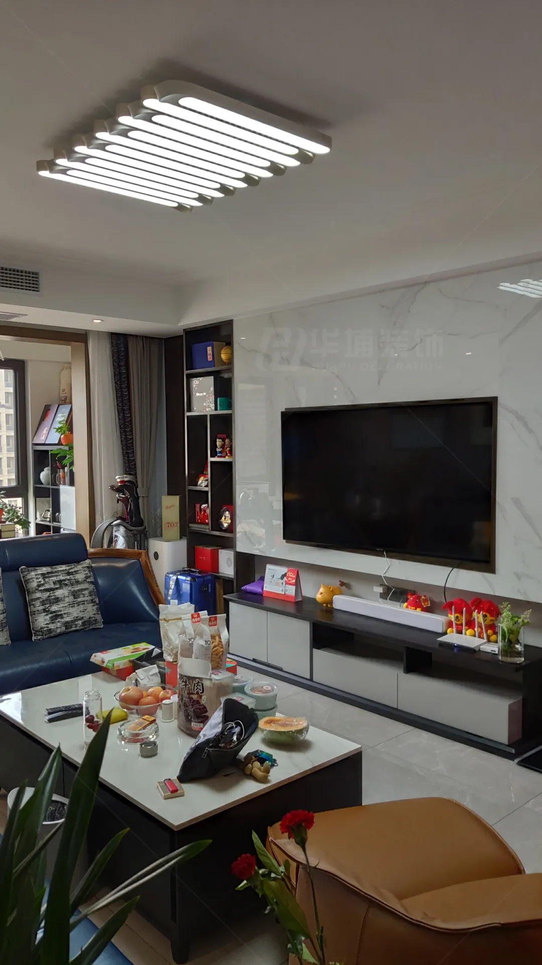 客廳是滿載生活氣息的區(qū)域,我們敲門做采訪的時(shí)候,業(yè)主家小姐姐正在跳電競(jìng)舞,再看桌上的小零食,這絕對(duì)是一個(gè)熱愛生活的家庭。客廳,我們?nèi)胙劭吹降挠惭b部分是比較純素的,因?yàn)槭侵醒肟照{(diào),家里東西又多,為了不顯得太過擁擠,頂面做了簡(jiǎn)單的處理,以一組主燈作為唯一光源。電視墻是以石材+儲(chǔ)物格的方式做設(shè)計(jì),預(yù)留出魚缸的位置,將家里一些零散的物品收納。