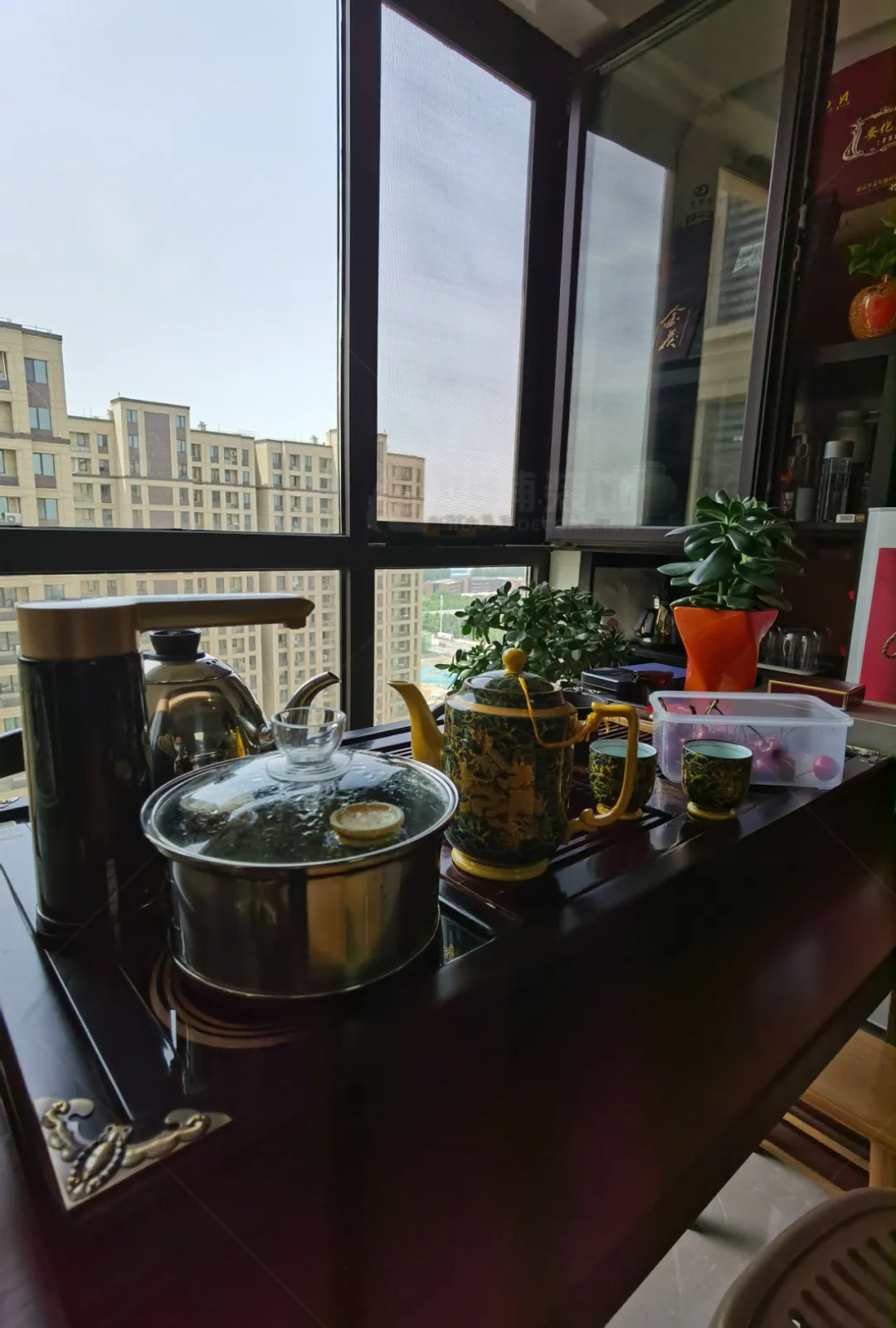 陽(yáng)臺(tái)和客廳是開放設(shè)計(jì),通過薄紗窗簾做簡(jiǎn)單的隔斷。業(yè)主是一個(gè)茶藝愛好者,一方茶幾,訴說情懷。