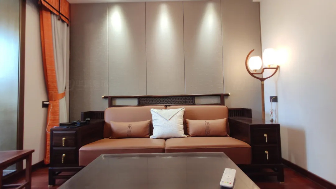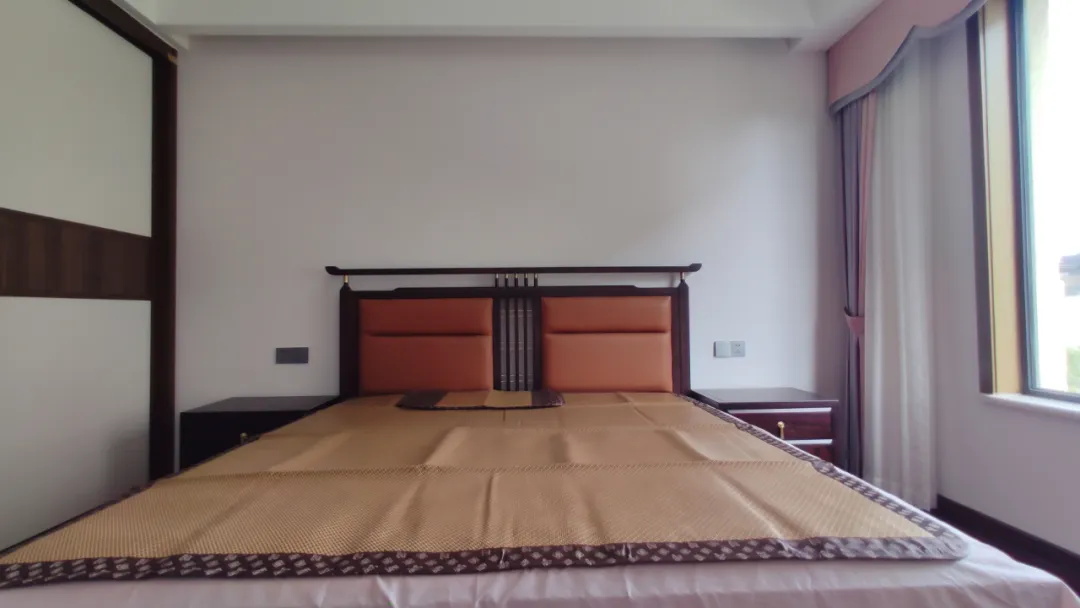 老人房以干凈溫馨為主,設(shè)計(jì)師用新中式特有的胡桃木色搭配皇帝色,來(lái)提亮整個(gè)空間。設(shè)計(jì)師小心思:窗簾選用棉緞質(zhì)感,它的垂度和密度相對(duì)較高,不會(huì)透光,這樣就解決了老人睡眠淺的問(wèn)題。