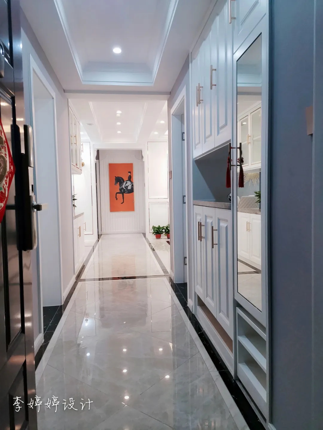 推開門,走廊盡頭的愛馬仕橙端景畫瞬間吸睛,將歐洲王室貴族馳騁沙場的那種霸氣盡情彰顯,也是業(yè)主商海浮沉多年的真實寫照。再看玄關(guān),一組白色整體定制柜,穿衣鏡、換鞋凳、鞋柜,干凈素雅,將主人外出歸家的所有小情緒承載,讓室內(nèi)不惹塵埃。