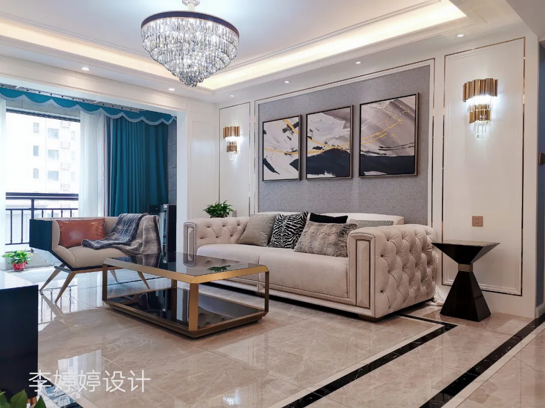 浮華退盡,歸于清寧。客廳整體以白色+金色構(gòu)圖,石膏線、護(hù)墻板、金屬條、水晶燈,光影交錯,滿目高級。客廳的軟裝是精心挑選的,金屬邊幾、抽象掛畫、薄紗窗幔,從材質(zhì)到配色再到花紋,用細(xì)節(jié)做空間情緒的表達(dá),“冷”“暖”相知。