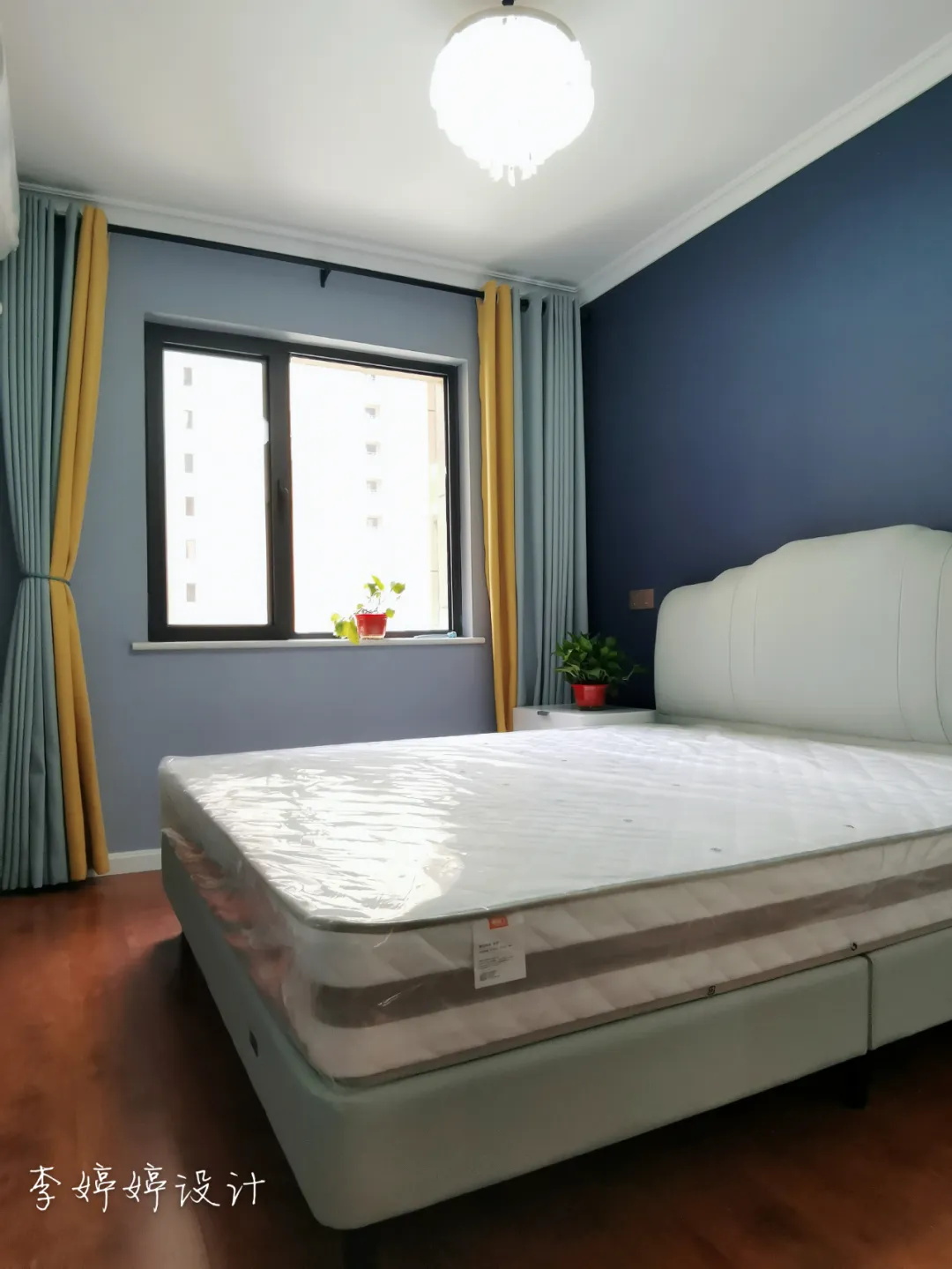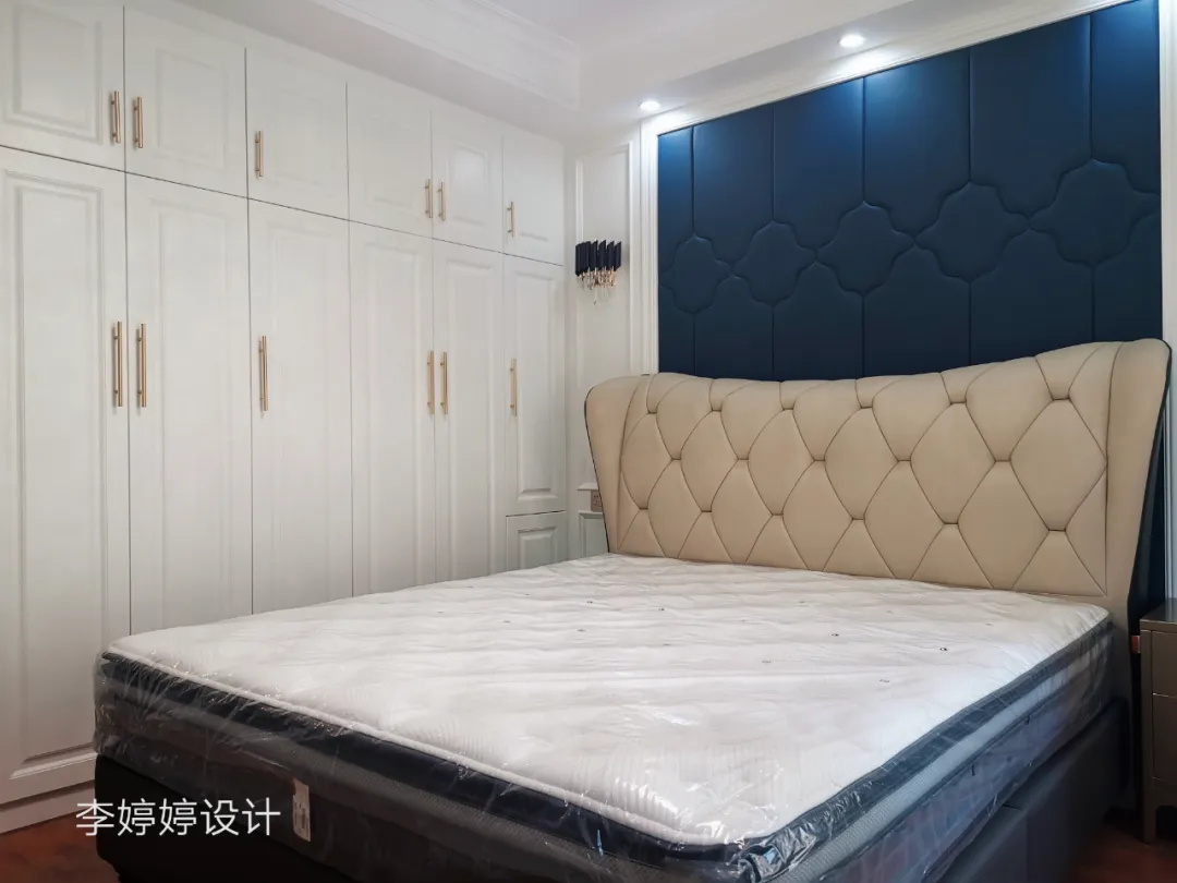 主臥空間相對擁擠,所以設(shè)計師在色彩的搭配上以白色+深藍(lán)色拉伸視覺,這樣不顯局促。臥室還做了一組通頂?shù)募儼滓鹿?,容納四季。