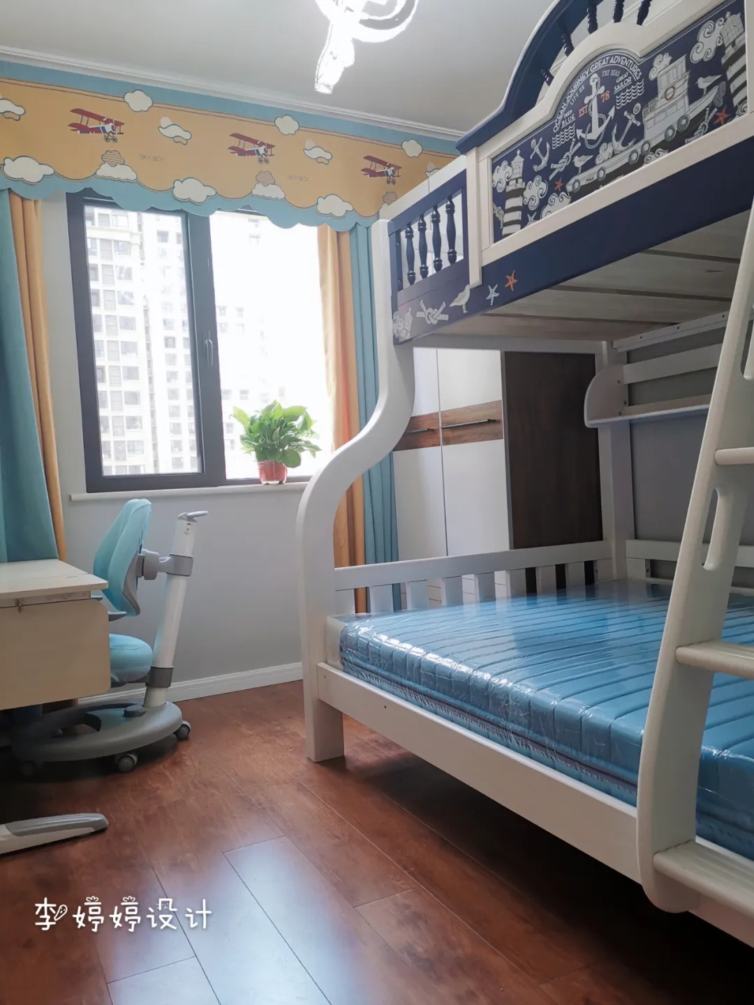 夫妻倆有一對雙胞胎男孩,所以兒童房做了上下鋪設(shè)計,并在窗簾壁布上做了一些卡通圖案來增加童趣。